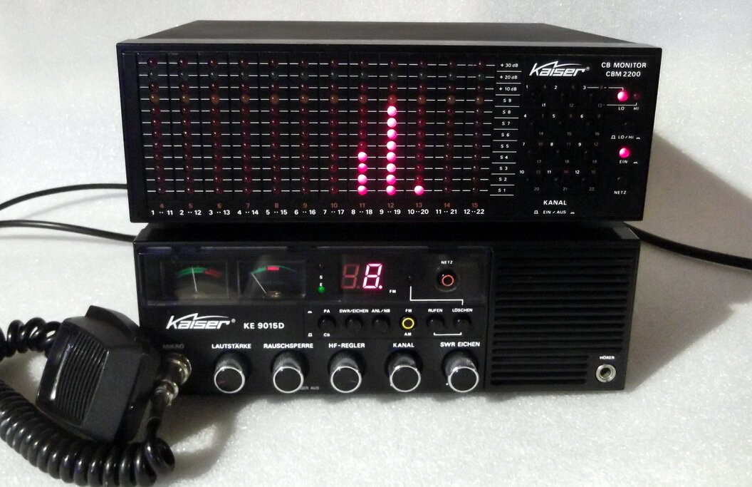 Einzig bei der KAISER KE-9015 D gab es in der gleichen Gehäusegröße auch einen CB-Monitor, den KAISER CBM-2200. Dieser wurde zwischen dem Funkgerät und der Antenne eingeschleift. Die Verbindung war ein Koaxkabel welches in der Regel kurz gehalten wurde. Dadurch erhielt der CB-Funker einen Gesamtüberblick aller 12 Kanäle seines Gerätes. Die unterschiedlich aufflackernden LED-Anzeigen des Monitors zeigten an, auf welchen Kanälen noch Funkbetrieb war. Hierzu musste der CB-Funker nicht die Kanäle durchsuchen, sondern sah, wo noch Funkaktivität war und konnte entscheiden, ob er diesen Kanal einschaltet bzw. auf diesen wechselt. Der Monitor war auf bis zu 22 Kanäle ausgelegt, da es im CB-Funk eine kürzere Zeitspanne gab, in der nach nur 12 Kanälen dann 22 Kanäle zugelassen wurden, bevor die damalige Zulassung für 40 Kanäle kam und es heute 80 Kanäle in Deutschland sind. Zuerst also 12 Kanäle, dann 22, danach 40 und zum heutigen Schluss 80 zugelassene CB-Funk Kanäle in Deutschland.