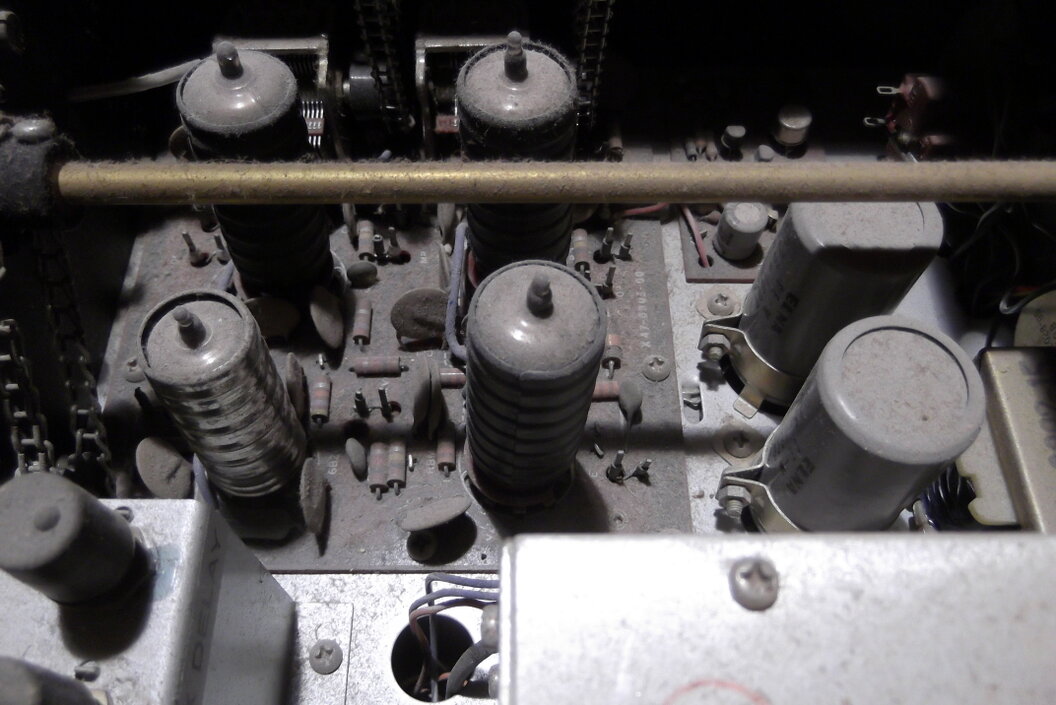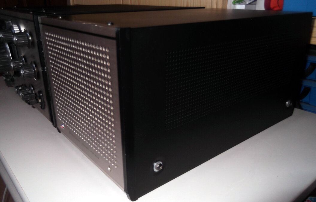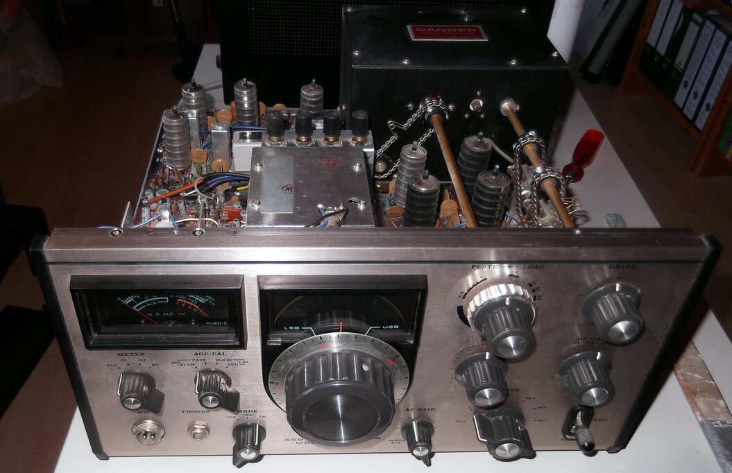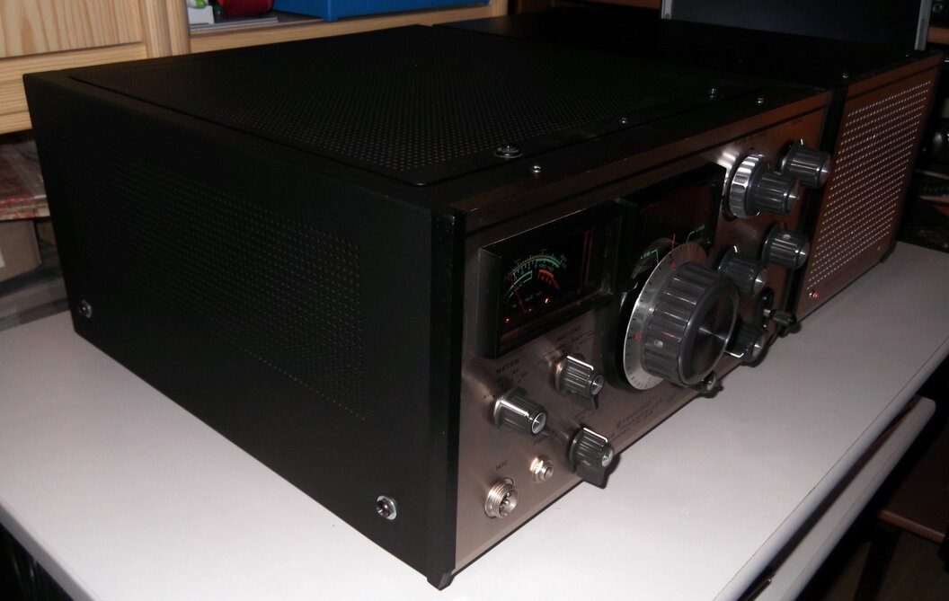 Fertig. Reinigung abgeschlossen und Gehäuse bearbeitet. Der Empfänger läuft nun bestens. Es gibt auch keine krachenden Potis mehr. Natürlich sind hier und da noch ein paar kleine Kratzer auf den Aluminiumfronten zu sehen. Das darf auch sein, denn das Alter sollte zum Gerät passen. Wir Menschen bekommen im Alter auch Falten. Die Bedienknöpfe wurden abgebaut und einzeln gereinigt. Die dreckigen Frontplatten wurden auch mehreren Reinigungsgängen unterzogen. Das leicht schief eingebaute S-Meter sitzt nun richtig. Das Gerät wurde einem mehrstündigen Empfangstest unterzogen und hat jetzt keine Ausfälle. Der Sendetest steht noch aus. Ich gehe auch noch von einem Abgleich aus.