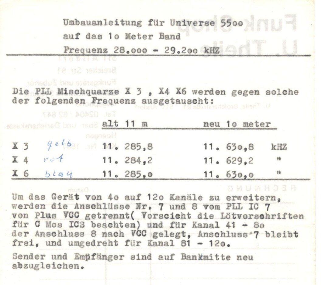 Zufällig fand ich bei einem Ankauf eines Konvoluts an Betriebsunterlagen auch eine Umbauanleitung für dieses Gerät aus der damaligen Zeit, die ich hier nicht vorenthalten möchte. Seinerzeit wurde diese Notiz auf die Rückseite eines Rechnungsblattes eines Funkhändlers geschrieben. Im Jahr 2022 ist diese Dokumentation somit schon gut 44 Jahre alt. Wichtig: Der Umbau erfolgt in Eigenverantwortung. Weder der Verfasser des Berichtes noch der Domaininhaber haben überprüft, ob der Umbau möglich ist und ob Schäden dadurch am Gerät entstehen können. Sie sind, wenn Sie sich an der nachfolgenden Anleitung orientieren, für alle dadurch entstehenden Schäden selbst haftend. Der Verfasser und der Domaininhaber sowie der Internetanbieter dieser Webseite sind aus der Haftung. Überlegen Sie gut, ob Sie diese technische Modifikation durchführen wollen. Alle Angaben ohne Gewähr.