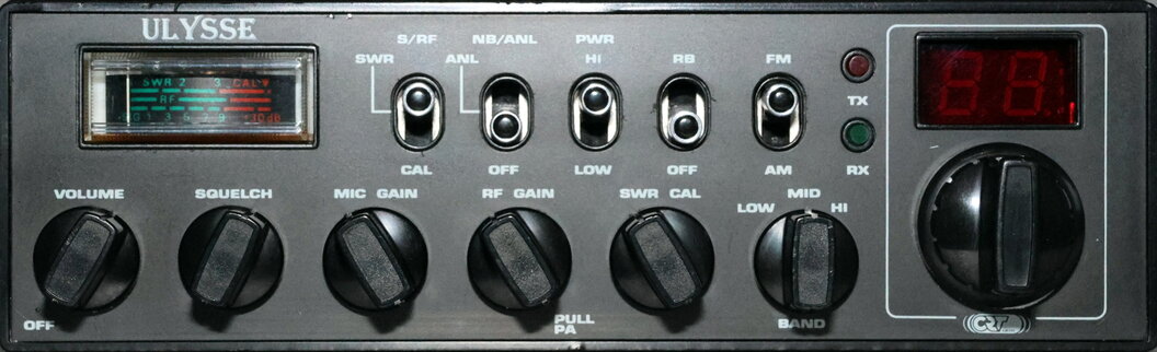 - Schalter CAL / SWR / S-RF. Dieser Schalter dient zu Bestimmung des eigenen SWR. Also wie gut ist die Antenne abgestimmt und können Schäden bei Fehlanpassung am Funkgerät entstehen. Grundsätzlich gilt, eine gut abgestimmte Antenne ist mehr Wert, als die Sendeleistung des Funkgerätes. Wie wird nun das SWR (die sogenannte Stehwelle) gemessen. Hierzu geht man wie folgt vor. Es empfiehlt sich, das Funkgerät auf Kanal 20 (MID) zu stellen. Somit ist man in der Mitte des kompletten Kanal- bzw. Frequenzbereiches, das die CRT ULYSSE anbietet. Nun den Schalter auf CAL stellen. Dann die Mikrofontaste drücken und mit dem Regler SWR-CAL (5) die Anzeigennadel der Multifunktionsanzeige (8) bis ans Ende des roten Bereiches drehen. Die Mikrofontaste weiterhin gedrückt halten und nun den Schalter auf SWR stellen. Jetzt kann der SWR-Wert abgelesen werden. Je weiter links auf der Multifunktionsanzeige die Nadel ist, desto besser. Ein Sendebetrieb über 2 ist nicht empfehlenswert, da hier von Schäden am Gerät ausgegangen werden kann. Wird der Schalter auf S/RF zurückgestellt, ist der Funkbetrieb möglich. Wichtig ist, das SWR muss immer mal wieder kontrolliert werden. Schlechtes SWR kann das Gerät zerstören.