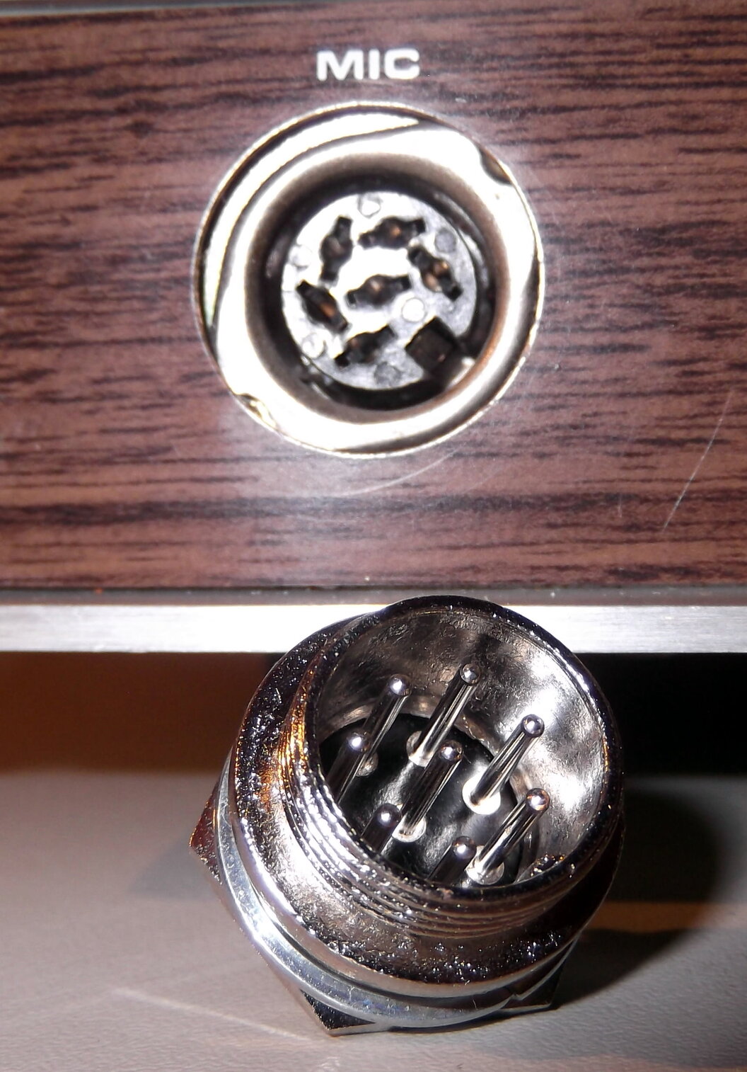 - Die Mikrofonbuchse ist 6polig. Der Verdacht besteht, dass eventuell eine UP/DOWN-Funktion über ein passendes Mikrofon möglich wäre