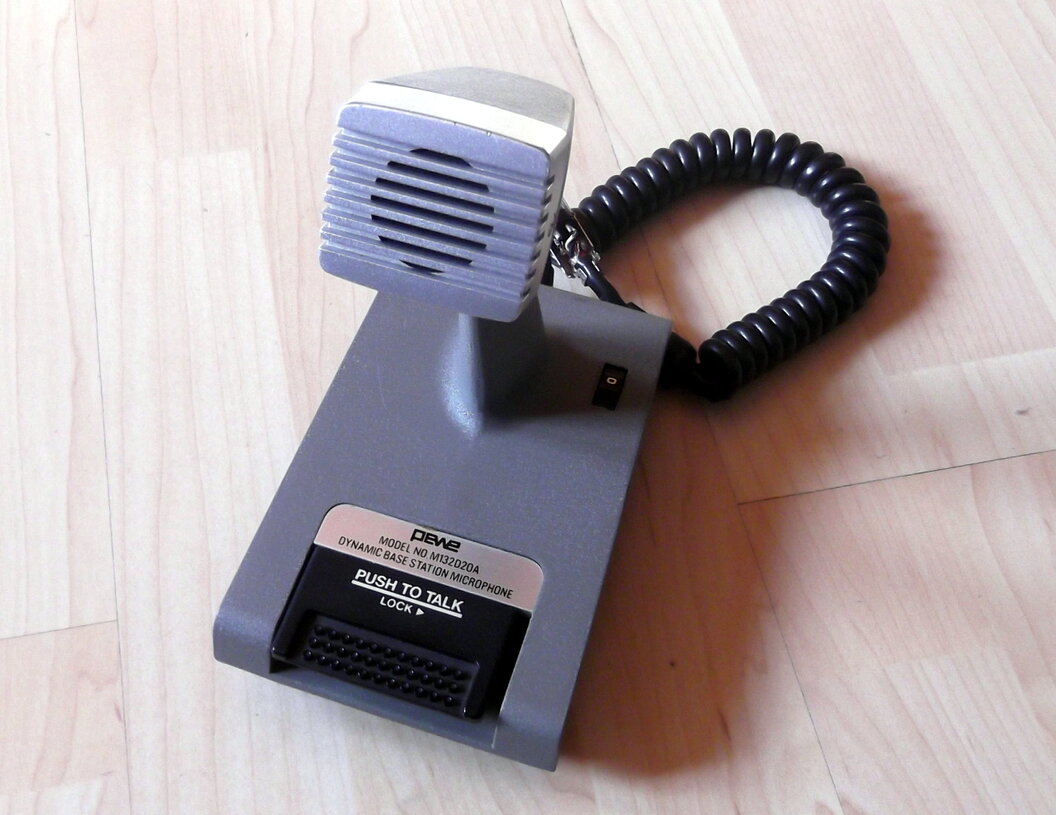 Das hier vorgestellte Standmikrofon ist sehr wertig und massiv gearbeitet. Die genaue Mikrofonbezeichnung lautet DYNAMIC BASE STATION MICROPHONE MODEL M1320D20A. Dieses Mikrofon wird je nach Erhaltungszustand zwischen 50.- und 100.- EURO auf dem Markt angeboten. Das besondere an diesem Mikrofon ist die Feststelltaste. Viele Mikrofonhersteller hatten dazu einen extra Schalter verbaut. Beim PEWE Mikrofon schiebt man die schwarze Sprechtaste im gedrückten Zustand nach rechts und somit ist sie gelockt. Wird sie wieder nach links geschoben, löst sie sich aus dem Feststellmodus und kann ganz normal bedient werden. Das Gehäuse ist ein schweres Gussgehäuse und die Bodenplatte aus massivem Aluminium. Lediglich die Mikrofontaste und die silberne Abdeckung der Mikrofonkapsel sind aus Kunststoff. Wir dürfen hier von echter Qualitätsarbeit sprechen.