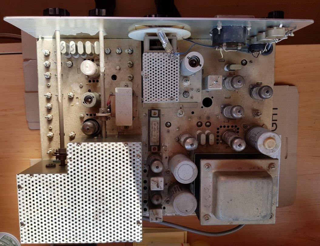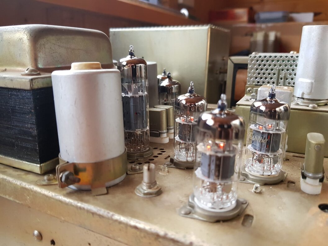 Ich begann mit dem Entfernen der Röhren, diese zu reinigen und wieder einzusetzen. Teilweise waren sie schief positioniert. Auf der Unterseite, bei der so einiges eher fliegend verdrahtet ist stellte ich fest, dass manche Bauteile so nah beieinander waren, dass vermutlich hier Ströme bzw. Spannungen entstehen können die nicht gut für das Gerät sind. Nachdem ich auch alle Bedienknöpfe zur Reinigung entfernt den Mode-Schalter gangbar gemacht und die Unter- sowie die Oberseite gereinigt hatte, begann ich wieder mit dem Zusammenbau um das Gerät ein zweites Mal unter Strom zu setzen.