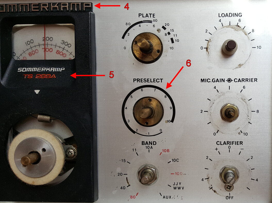 Auf Position 4 befindet sich der Schriftzug. Den gibt es in dieser Form bei keinem Gerät sondern nur bei dem vorliegenden TRX. Position 5, die Bezeichnung des Gerätes, ist in rot. Das ist bei anderen Geräten nicht zu finden. Auf Position 6 befindet sich der PRESELECT-Regler, der bei allen Geräten die Bänder anzeigt. Hier sehen wir lediglich die Scala 1-10.