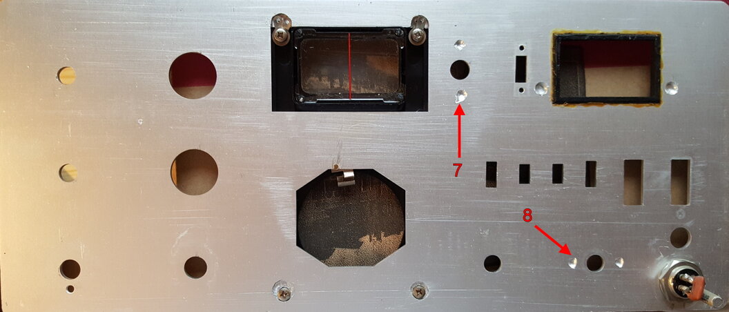 Auf der Rückseite sind bei Position 7 und 8 deutliche Bohrversuche zu erkennen die aber nicht ganz durchgeführt wurden und von außen an diesen Stellen nichts zu sehen ist. Des Weiteren ist der Rahmen des Mehrfachinstrumentes eingeklebt und auch sonst macht die Rückseite keinen professionellen Eindruck. Schleifspuren sind erkennbar und auch die in der Mitte befindliche VFO-Abdeckung ist von der Rückseite mit simplen Schrauben und Lötfahnen befestigt worden.