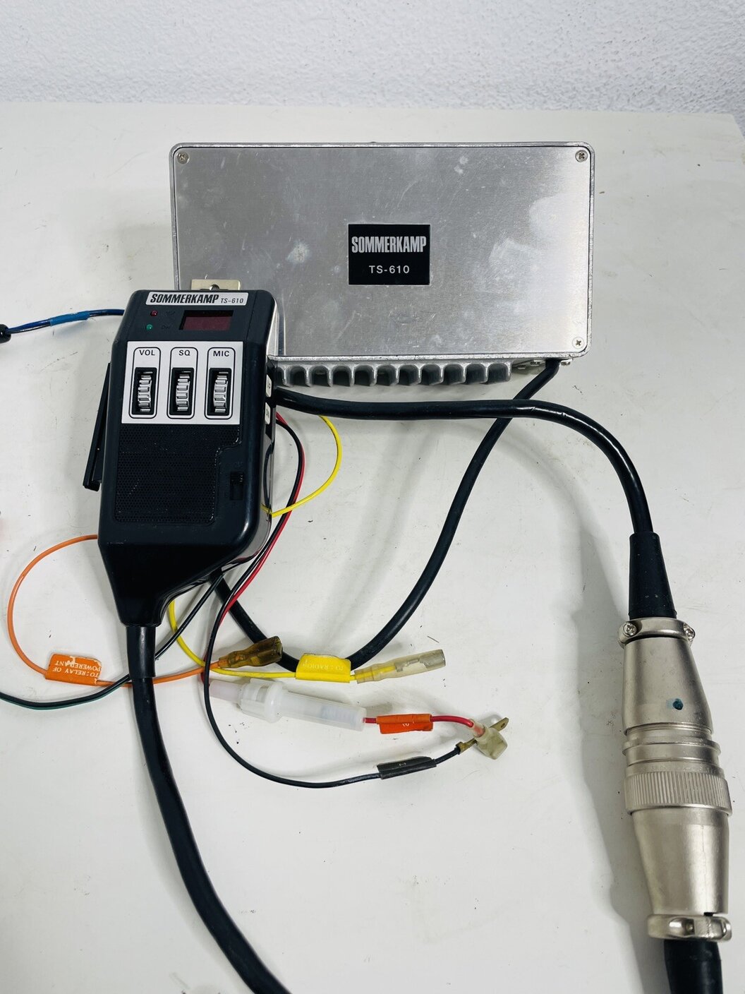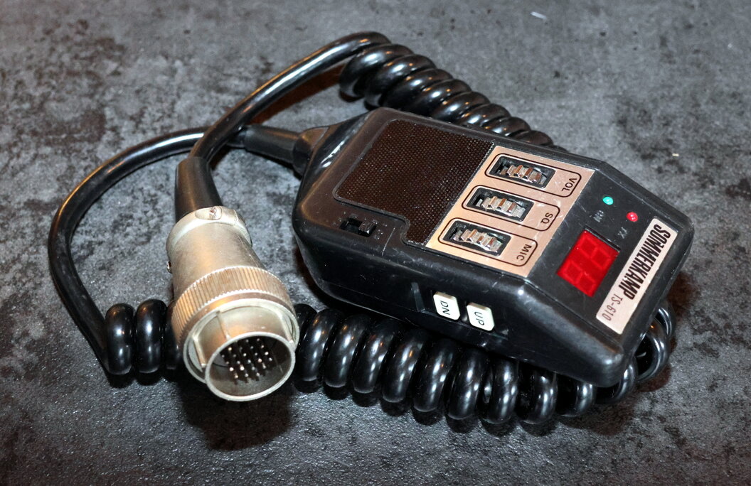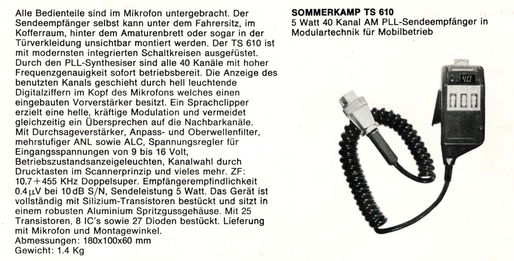 Die Sommerkamp TS-610 ist extrem selten und war im Katalog von 1978 noch abgebildet, im nachfolgenden Katalog 1978/1979 schon nicht mehr. Über die tatsächlichen Verkaufszahlen ist auch hier, wie bei den anderen Produkten der Marke SOMMERKAMP, nichts bekannt. Das besondere bei diesem CB-Funkgerät ist, dass alle Bedien- und Anzeigeelemente sich im Mikrofon befinden und das Funkgerät selbst als sogenannte Blackbox fungiert. Verbunden mit einem 24poligen Kabel kann die Blackbox unter dem Fahrersitz, im Kofferaum oder nahe bei der Antenne montiert werden. Bedauerlicherweise ist fast selten die Blackbox und das Mikrofon zu finden. Meistens fehlt die Blackbox oder das Mikrofon und somit ist dieses Funkgerät nicht komplett. Nachfolgend zum einen die Beschreibung aus dem Katalog von 1978 sowie eine Fotoaufnahme meines halben Funkgerätes, dem Mikrofon.